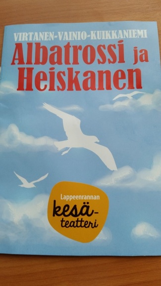 Tälläinen teatteri esitys olis tarjolla! Aika: 16.7.2015 klo 13:00 - 16:00 Paikka: Lappeenranta Kesäteatteri (Alpatrossi ja Heiskanen)